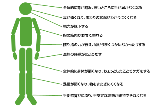 体型の変化、身体機能の変化、運動能力の減退、思考能力の低下、記憶力の衰退など、加齢により多少の個人差はあるももの、ある年齢に達すると平均的に「身長、手足が縮む」「胴回りが大きくなる」「下腹部が出てくる」「腰が曲がる」「背中が丸くなる」など様々な変化を伴います。